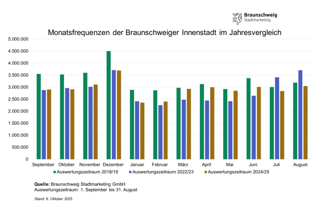 Im Auswertungszeitraum vom 1. September 2024 bis zum 31. August 2025 erfassten die Lasermessgeräte des Stadtmarketings an acht Standorten in der Braunschweiger Innenstadt rund 41,9 Millionen Passantenbewegungen. Das bedeutet eine Steigerung von rund 0,5 Prozent im Vergleich mit demselben Zeitraum im vorletzten Jahr. Aufgrund großflächiger Messausfälle konnte die Braunschweig Stadtmarketing GmbH für den Zeitraum des letzten Jahres (2023/2024) die Passantenfrequenzen nicht heranziehen.